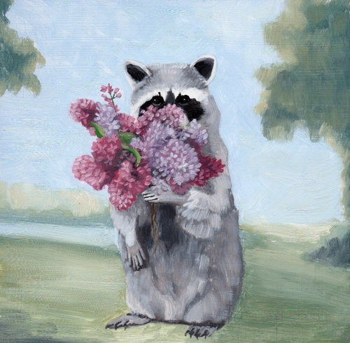 Raccoon Smelling Lilacs