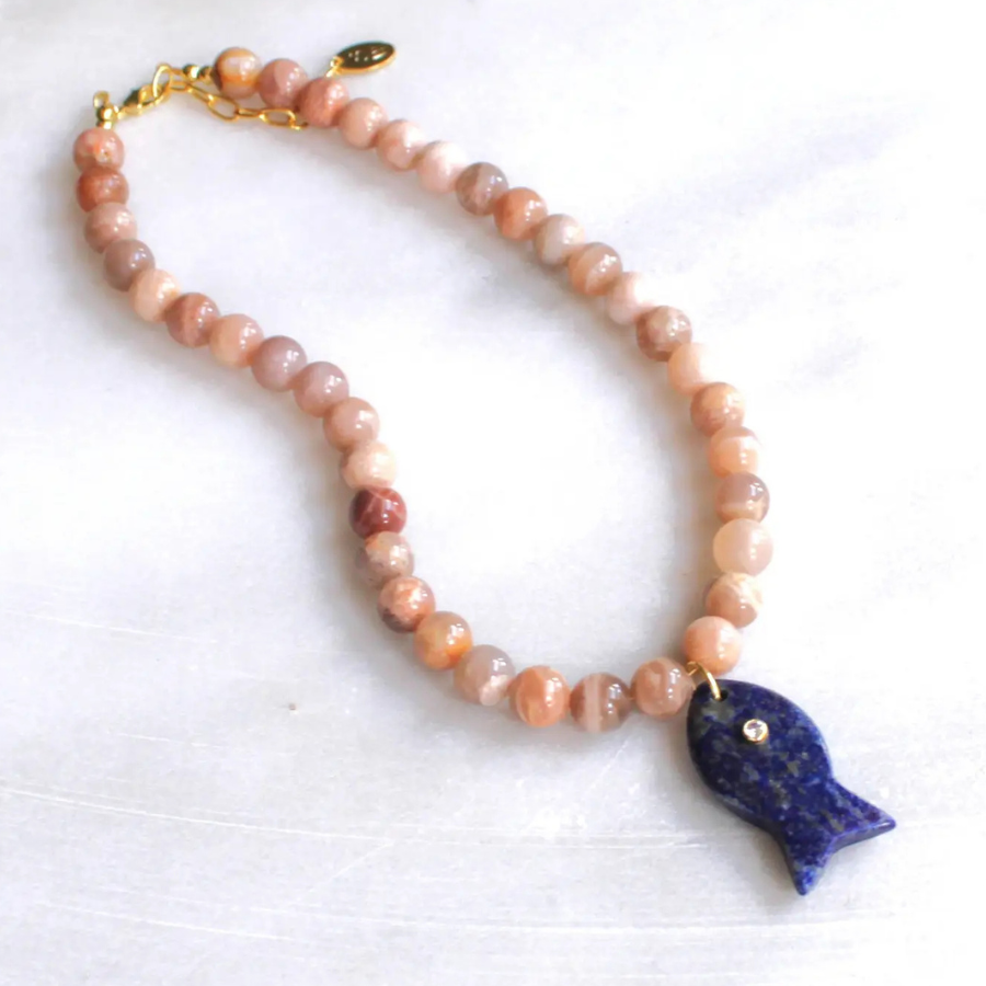 Fall in love with the charm of this handmade necklace created with peach moonstone beads and a lapis gemstone fish pendant.