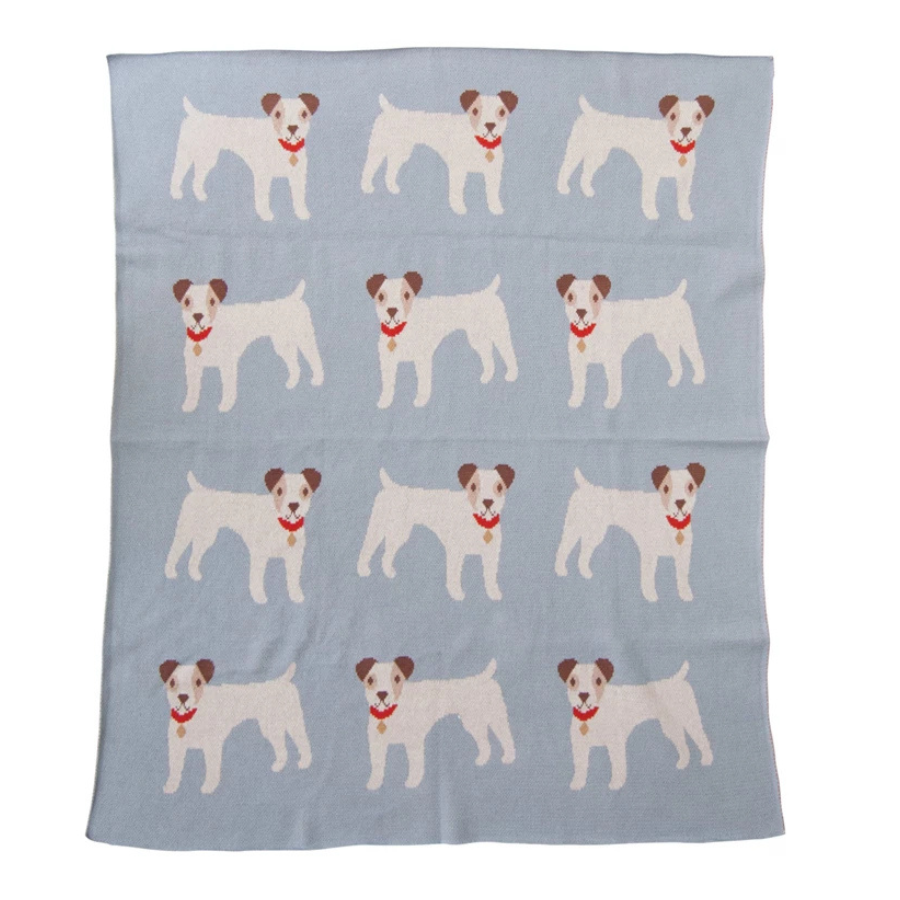 This cotton knit baby blanket with dogs is a cute accessory that can match any farmhouse, boho, minimalist, cottagecore, or modern-style nursery. It can be used to keep the baby warm and comfortable with its cozy design and quality material.