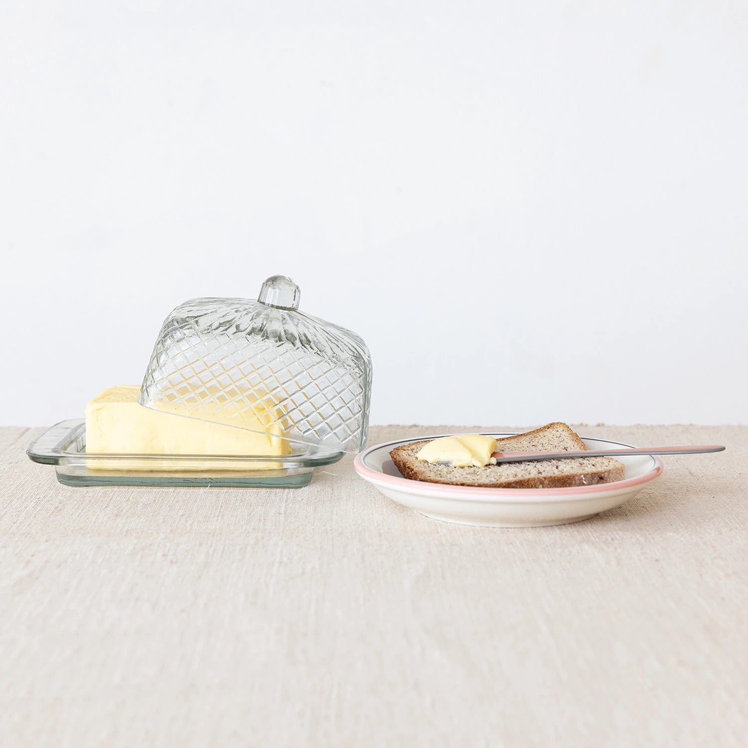 This embossed reclaimed glass butter dish is a beautiful and functional piece that will enhance the home with its clear color and rectangle shape. The butter dish is made of reclaimed glass, recycled from old bottles, jars, or windows.
