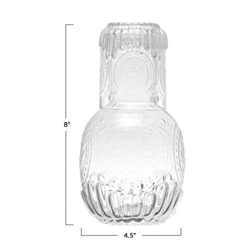 Elevate cocktail hour or evening gatherings with an offering of stylishly versatile pieces including cocktail shakers, mortar and pestles, strainers, bottle openers, champagne flutes, coupes, decanters, martini glasses, wine racks, and so much more. This intricately crafted carafe and accompanying glass showcases French country inspired debossed designs.