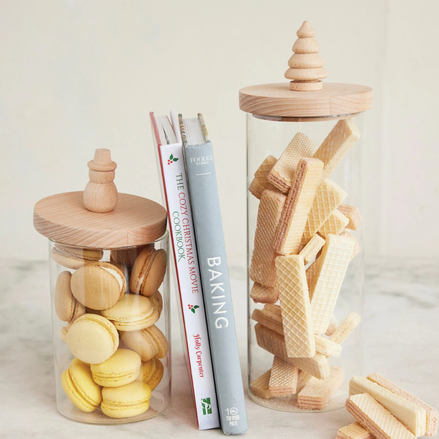 Choose between two festive styles with this glass canister featuring a natural wood lid topped with either a charming Christmas tree or a playful snowman knob. Perfect for holiday storage or decorative display, these canisters bring seasonal cheer and practical organization to your kitchen or living space. Celebrate the season with a stylish touch that brightens your home.