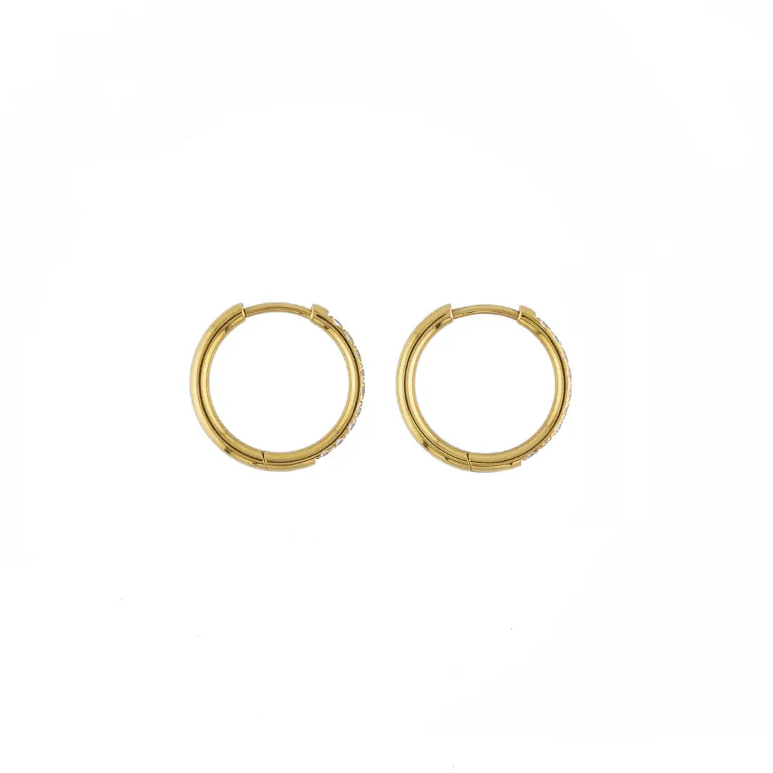 Classic with a twist. These 18mm diamond hoops are the ultimate in versatile sparkle. Dress them up or down, they’re perfect for any occasion and made from waterproof 18K gold over stainless steel, featuring stones that shine like real diamonds.