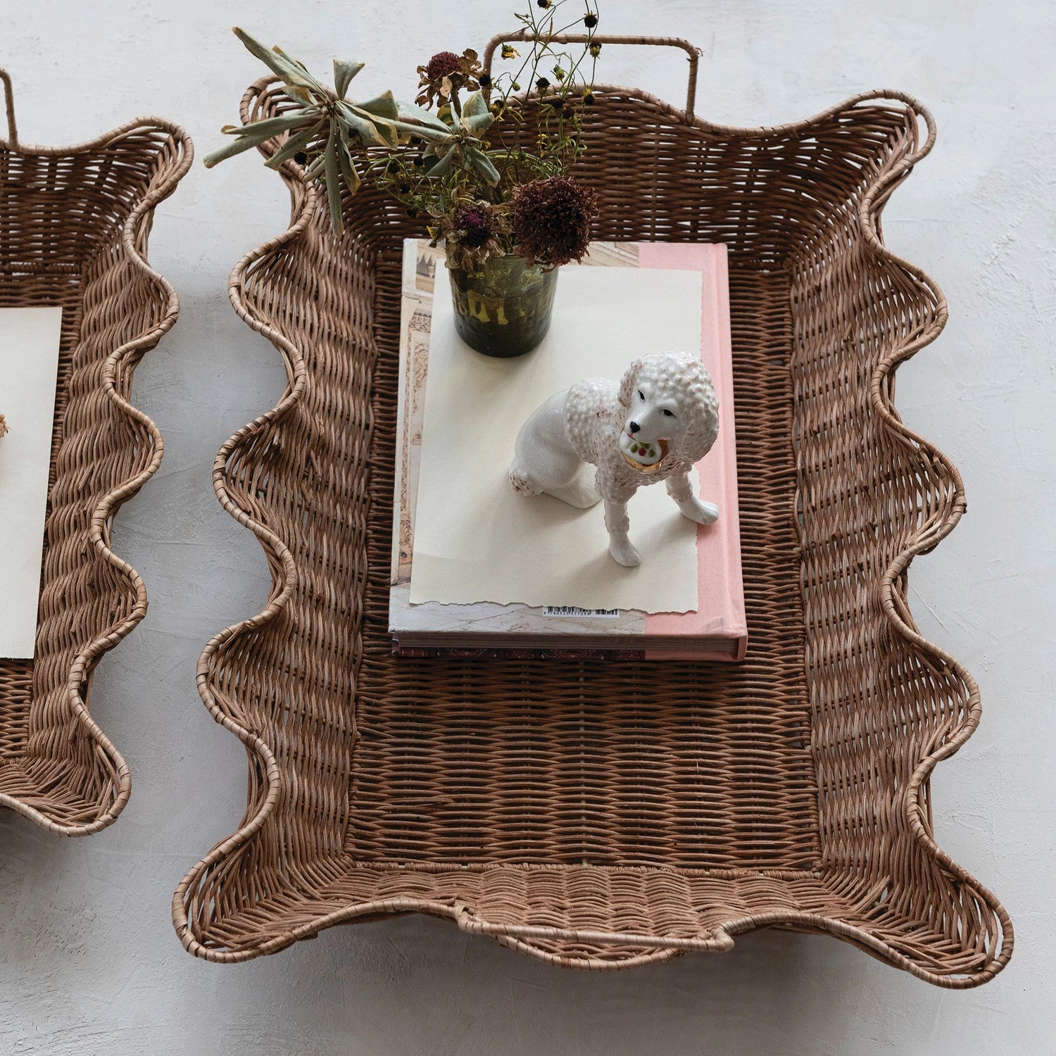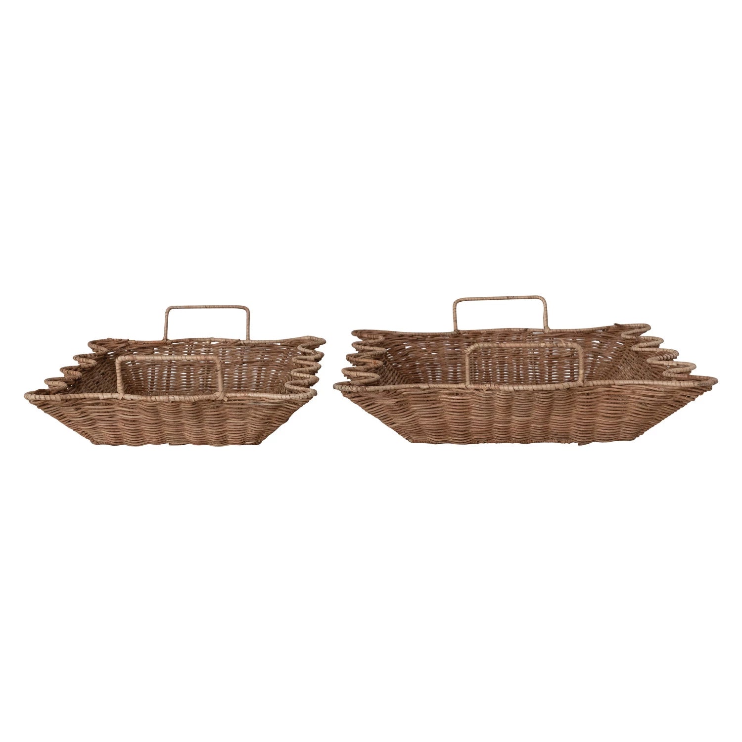 Bring warmth and texture to any room with this charming set of two hand-woven rattan nesting trays, each featuring delicate scalloped edges and sturdy handles for easy carrying and display. Perfect for organizing essentials on a shelf, coffee table, or entryway, these natural pieces add a touch of artisanal beauty to your home décor.