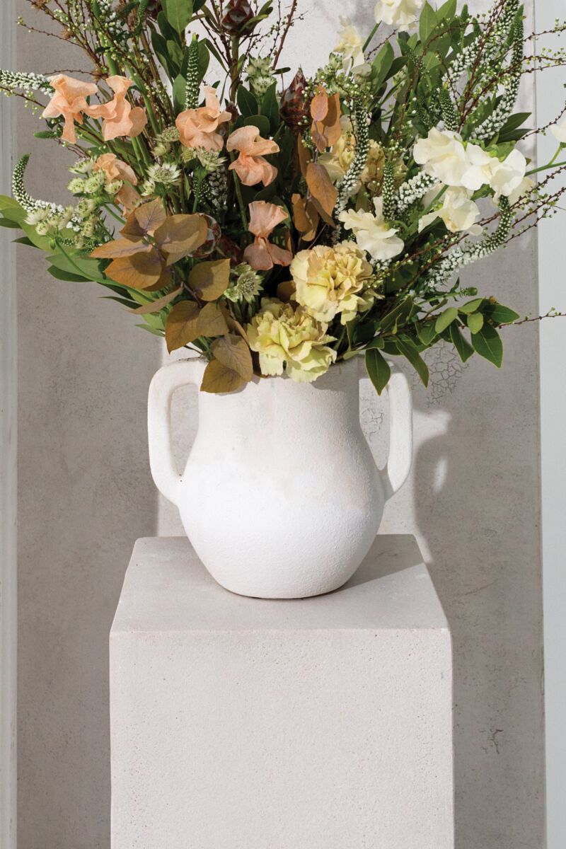 The Marvel Vase features a full bottom with two handles that lead up to a wide opening. Surface is bright white with a sandy texture.