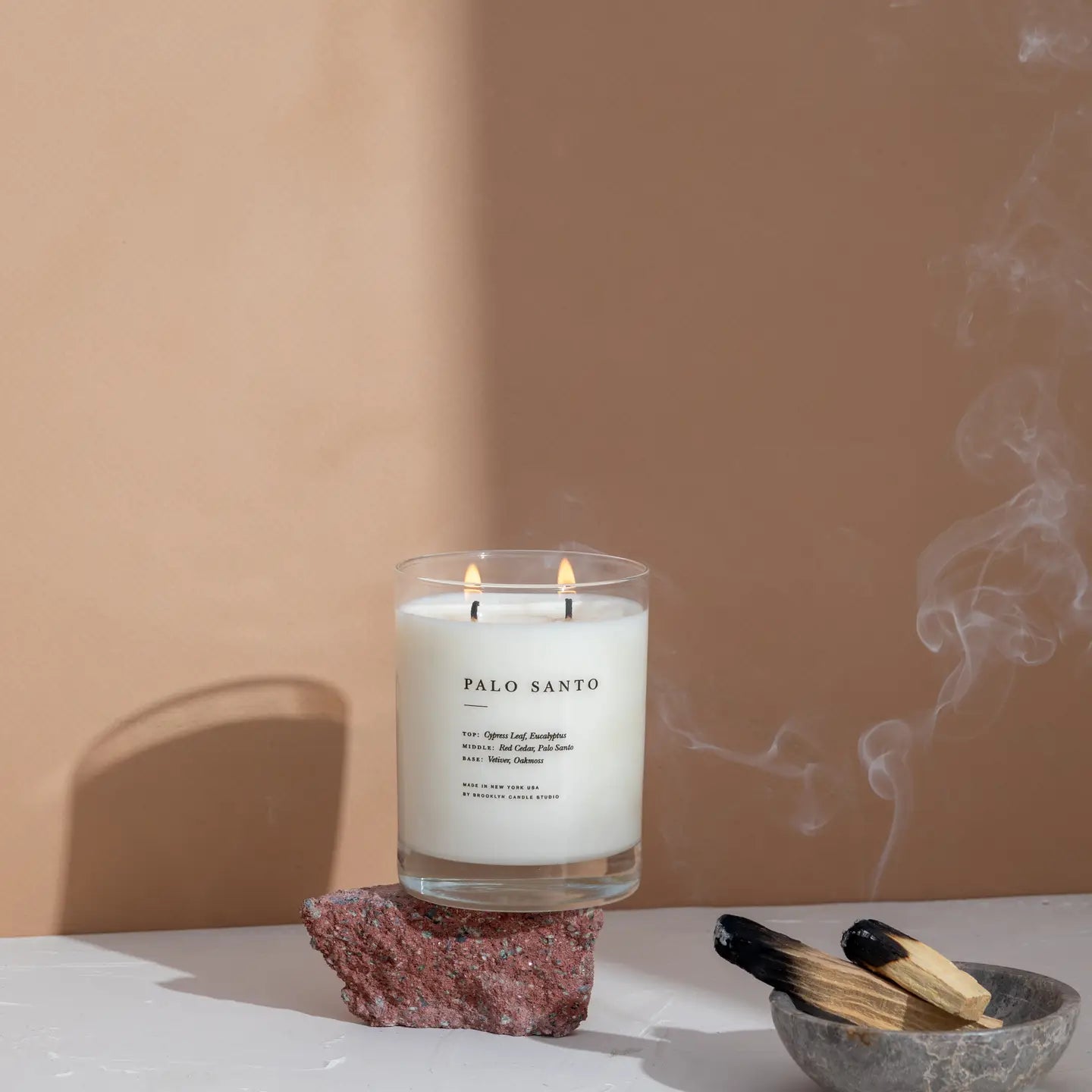 Since the Incan era, the fragrant wood has been ritualistically burned to cleanse a space of bad energy, and the oil is said to have purifying and healing properties. Our rendition features calming top notes of cedar and mint, middle notes of cypress, and eucalyptus, and warm base notes of sandalwood and amber. This candle is infused with eucalyptus, peppermint, and cedarwood essential oils.