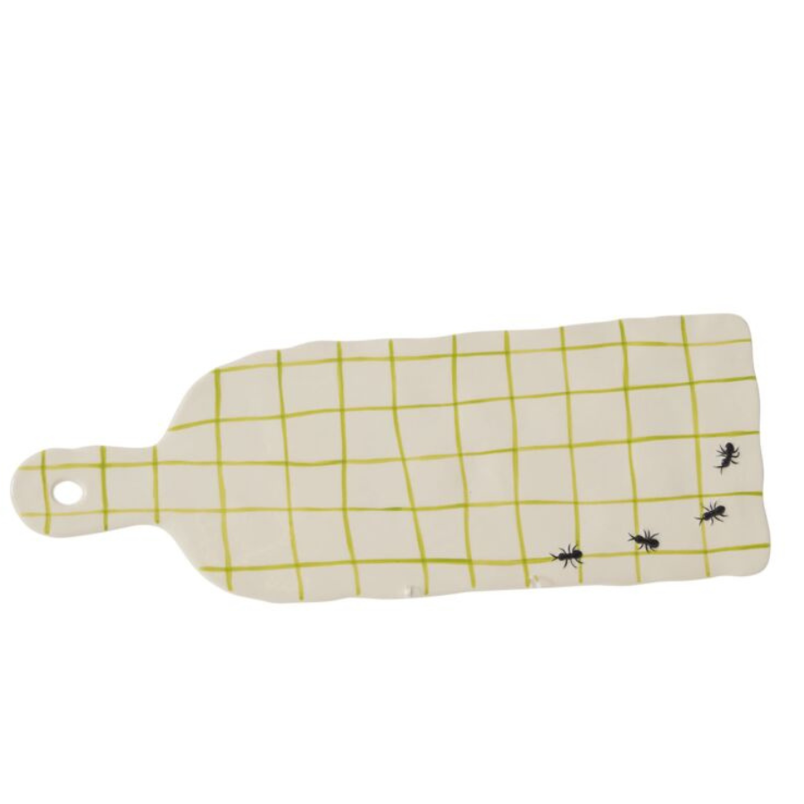 With an organic shape that offers handcrafted appeal and a hand painted carved grid and ants, the rectangular ceramic Picnic Cutting Board is a playful nod to spring. Featuring a glossy finish over a warm white background, a grid pattern in a yellow green hue, and a dimensional line of ants, this food-safe tray is a lovely serving piece with its easy-to-hold handle or decorative item with a hole for hanging on the wall.