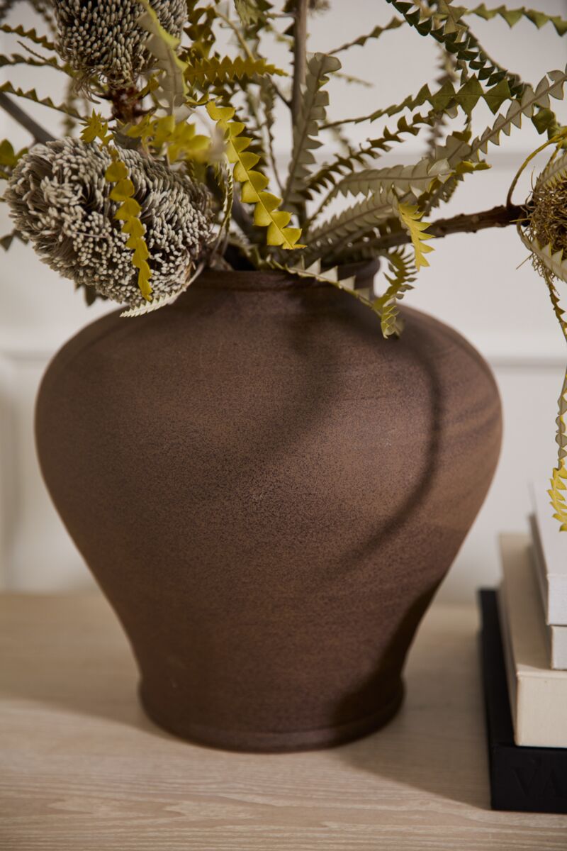 Bring a warm, old world look to tablescapes with the shapely stoneware Repose Vase. Featuring a tapered opening, broad body on top, narrow base, & textured brown matte finish, this timeless vessel layers with other neutrals or grounds bolder pops of color on any surface. It's the perfect scale for a branchy arrangement or colorful bunch of florals.