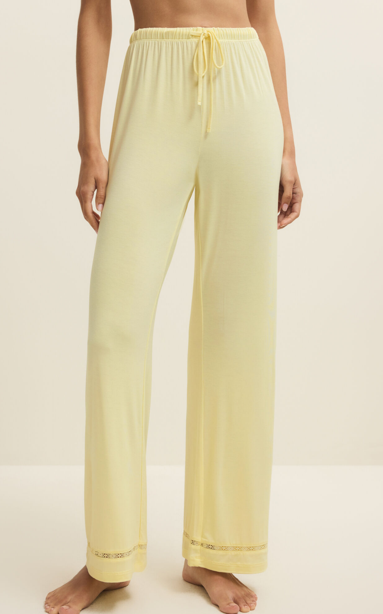 This full-length pant moves with ease with its flowy silhouette and soft drape. Finished with a drawstring waistband and lace hem detail, it’s our go-to style for relaxing in style.