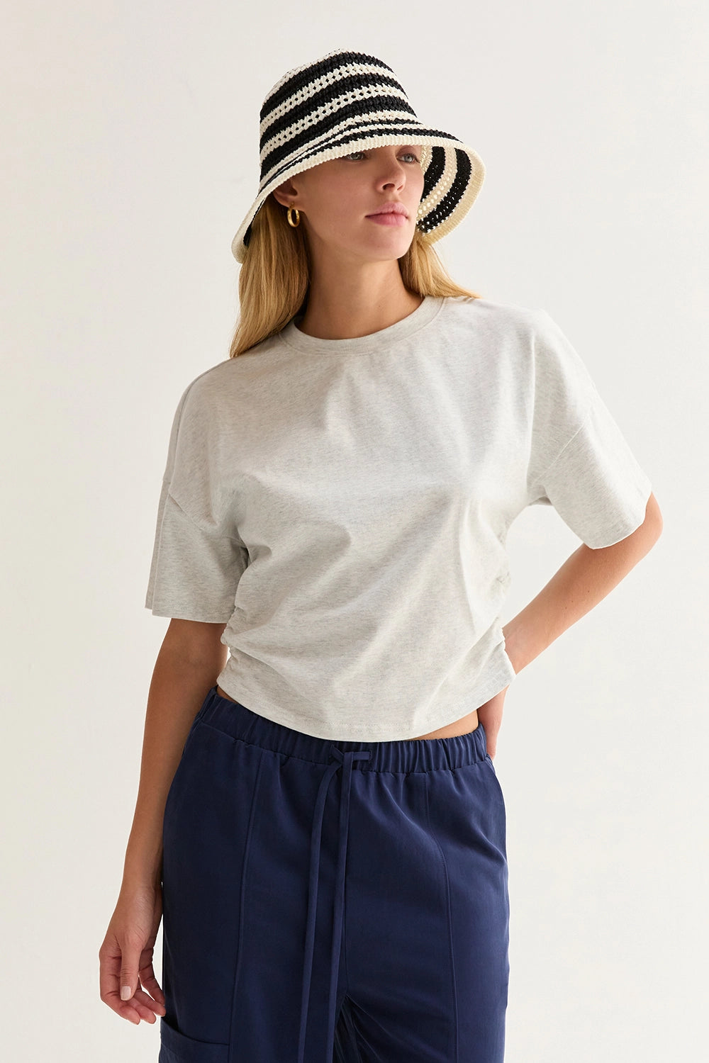 Suzy Semi Cropped Elbow Sleeve Ruched Top - Crew neckline with ribbed trim - Short sleeves - Cinched waist for a flattering fit - Soft and breathable fabric - Model is wearing size Small