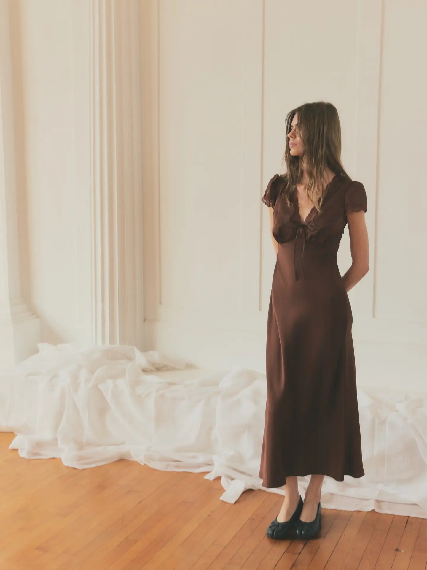 The Vivienne Dress is a bias-cut satin midi with delicate lace trim at the neckline and sleeve cuffs. It features a front V-neck with a self-tie closure, cap sleeves, and a side invisible zipper for a clean, elegant finish.