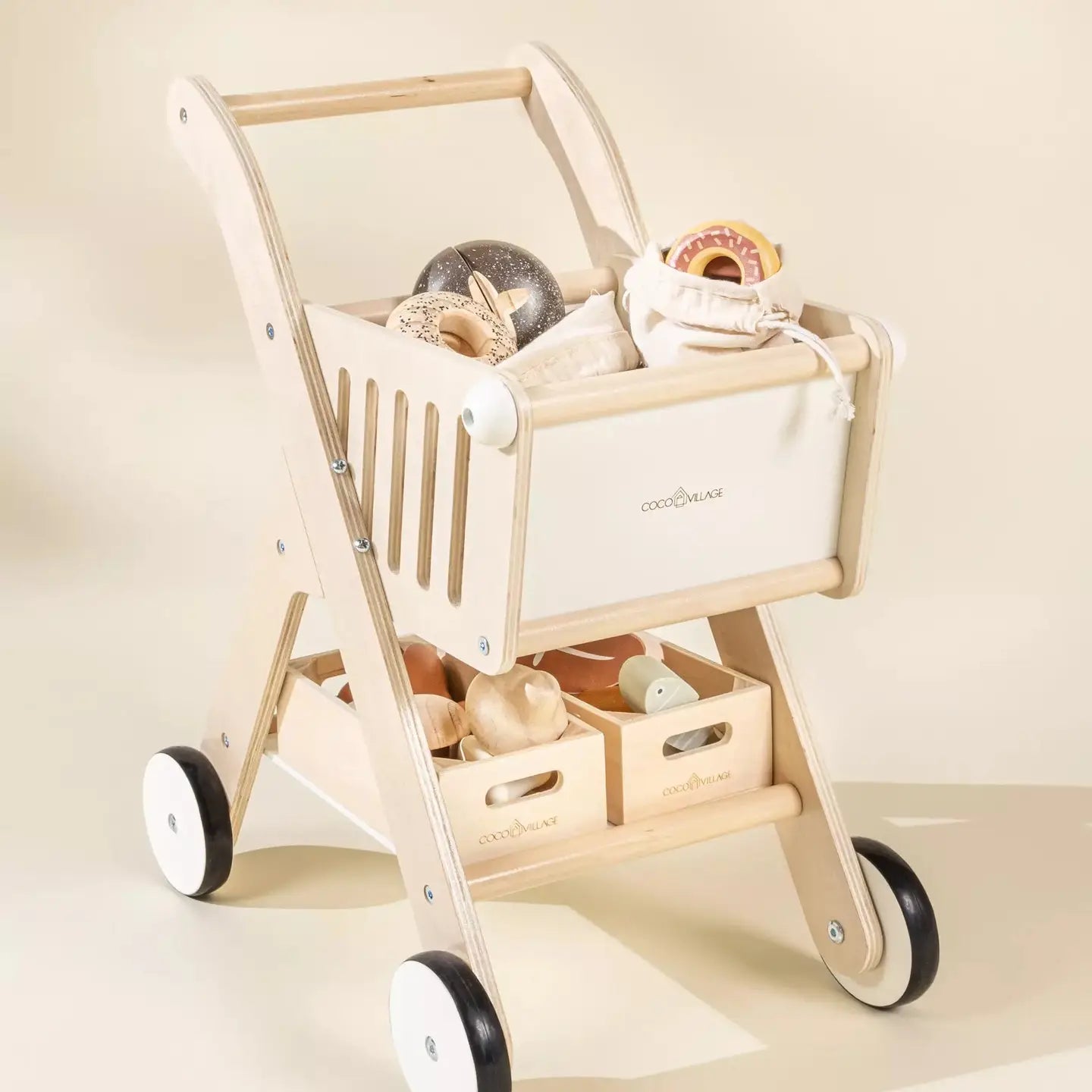 Children love to play pretend. The Wooden Shopping Cart is perfect on its own or combined with pretend play modules, such as the Mini Wooden Play Market Stand and the wooden playsets.